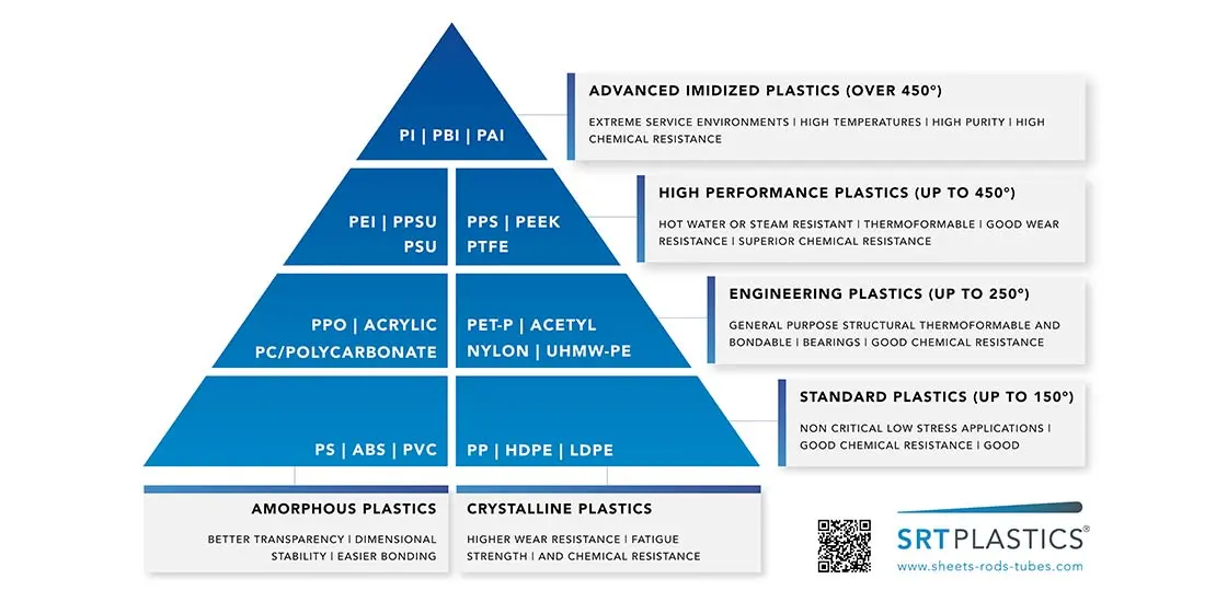 Er bestaan honderden kunststofsoorten, elk met unieke eigenschappen en prestaties. De Kunststofpiramide biedt een helder overzicht: een visuele gids die kunststoffen rangschikt van standaard tot high-performance toepassingen.